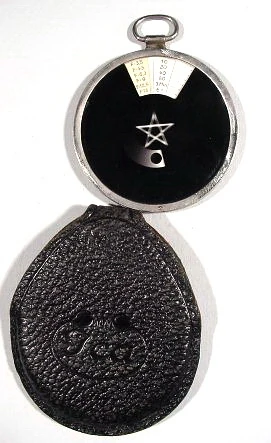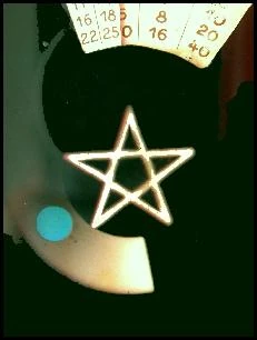 The meter has a viewfinder on the back. You look into the finder and see the motiv through a blue filter. By turning the outer ring of the Diaphot the filter grows lighter or darker. When the black and the grey parts of the motiv have only one colour, this is the right setting. Now you can read time and aperture settings.