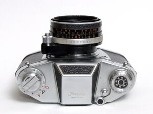 The prism is permanently fixed with a plain groundglass, and the camera has a regular focal-plane shutter running vertically. The wind lever is not as smooth as that of Exa Ia, probably because of a different shutter mechanism. The body shape, size, and weight are similar to those of the Exa I line, and the feel and finish somewhat better.