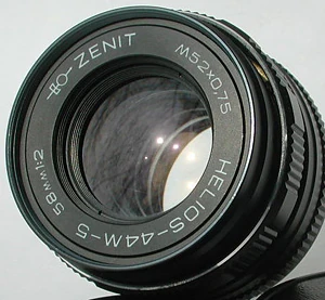 Helios-44 is a series of standard lenses for SLR cameras, produced in Soviet Union by KMZ, MMZ, Jupiter from 1958 until 1999; it is considered to be one of most mass produced lenses in the world. Based on the lens Biotar 2 / 58 , at the beginning was called "БТК" - "БиоТар Красногорский" (BioTar Krasnogorski). A fast 6-element anastigmat, it was available in both single-coated and multi-coated versions.