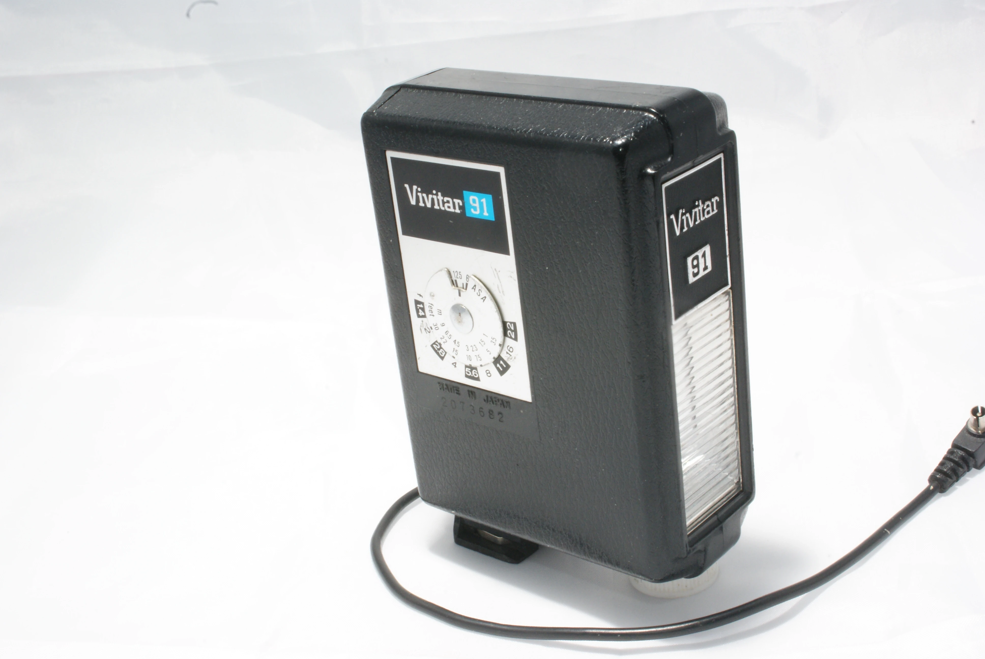 The Vivitar Model 91 electronic flash c. 1964 is a very reliable and sturdy manual flash unit made by Vivitar Corporation a subsidiary of Ponder & Best, Inc. It has a cold shoe mount and a permanently affixed PC sync cord that connects to a camera's x-sync terminal. An exposure compensation dial mounted on the side is used to quickly determine camera aperture settings based on known film speed and distance to subject. On/off switch and ready light are on the back side.